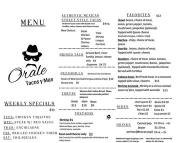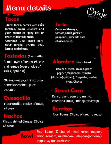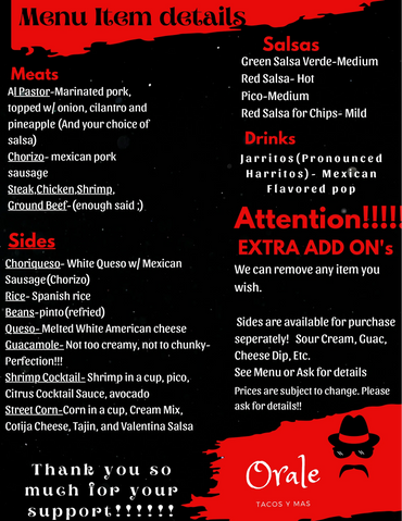 We love our customers, so feel free to visit our Facebook Page Orale Tacos y mas LLC!! Stop in to dine in or carryout!